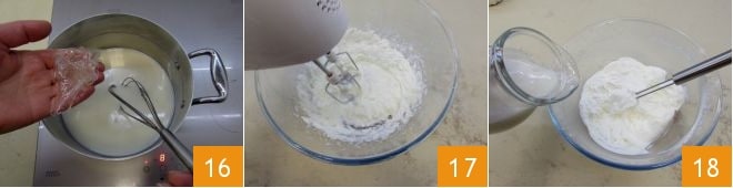 Squeeze the gelatin sheets well and add them to the mixture 16, stirring well until completely dissolved, then turn off the heat and let it cool. Whip the cream with a whisk 17 and, when the mixture is completely cold, add it to the whipped cream little by little 18;