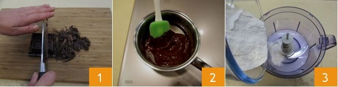 To prepare chocolate cookies, start by finely chopping the dark chocolate 1. Then transfer it to a bowl to melt it in a double boiler over very low heat 2; make sure the pot's water does not come into contact with the chocolate. Let it cool slightly while you prepare the cookies' base: in a mixer, pour the flour 3.