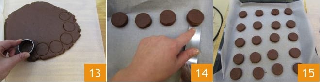 Once you have the desired thickness, take a cookie cutter with a diameter of 1.5-2 inches and start cutting the dough 13. Transfer the cookies thus obtained onto a baking tray lined with parchment paper. To move them, you can use a spatula 14 to avoid leaving fingerprints on the sides or surface of the cookies. Bake your chocolate cookies in a preheated static oven at 356°F for 13 minutes (if using a convection oven, you can bake them at 320°F for 5-6 minutes) 15. You can test the time and temperature for your oven by baking a first batch with a few pieces.