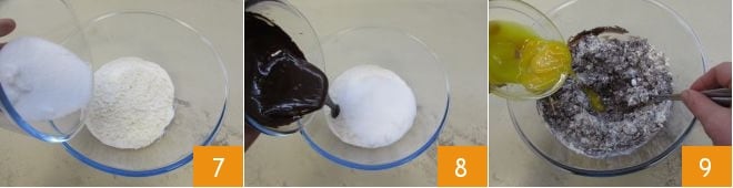 Add the sugar 7 and the now lukewarm melted chocolate 8. Separate the yolks from the egg whites (the indicated yolk weight is important to achieve a perfect consistency); add the previously beaten yolks to the mixture 9, using a fork.