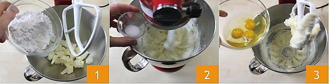 To prepare the harlequin cookies, beat the softened room temperature butter with powdered sugar 1 using a stand mixer with a paddle attachment or electric beaters until light and fluffy. Add the salt 2 and eggs 3, then mix until all ingredients are well combined.