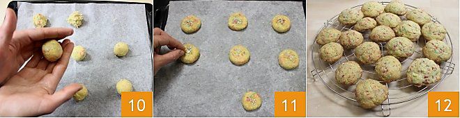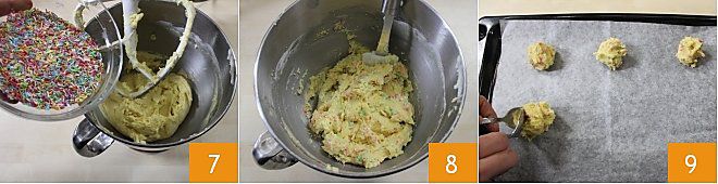 When the dough is smooth, add the colored sprinkles, reserving some for decorating the cookies, 7 and mix very quickly to avoid them melting 8. Now form the cookies: place small heaps of dough, about 1 oz each, on a baking sheet lined with parchment paper 9.
