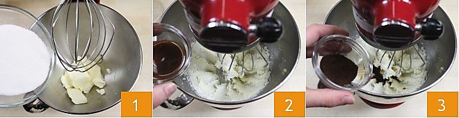 To prepare the coffee bean cookies, start by preparing the coffee. Meanwhile, pour the butter into the bowl of a stand mixer (or if you don't have a stand mixer, into a regular bowl to work with an electric mixer). Add the sugar 1 and mix until you obtain a smooth and creamy mixture. While still blending, add the liquid coffee 2 and the coffee powder 3.