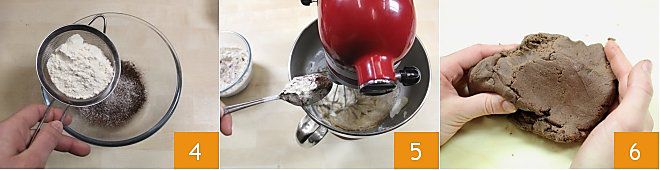 In a separate bowl, sift the flour and cocoa powder 4. Then insert the paddle attachment in the stand mixer and gradually add the flour mixed with cocoa powder 5. Mix until you get a compact dough, which you will transfer onto a work surface 6.
