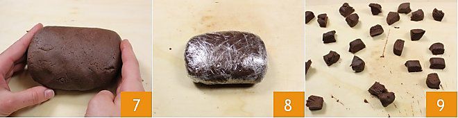Knead it with your hands, forming a solid and homogeneous block 7 and then wrap it in plastic wrap 8. Let it solidify in the refrigerator for at least 2 hours. After two hours, divide the dough into pieces weighing 0.5 oz each, using a scale 9.