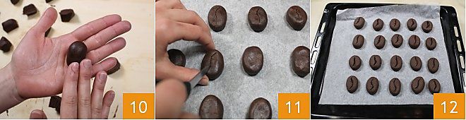 Shape each piece into an oval and slightly flattened ball 10, just like a coffee bean. Line a baking tray with parchment paper, transfer the beans onto it, and cut an 'S' with a small knife on their surface 11. Place the tray in the refrigerator for 30 minutes to let the beans firm up so they maintain their shape once baked. At this point, bake in a preheated static oven at 340°F for 20 minutes (if using a convection oven, bake at 300°F for 10 minutes). After this time, take them out of the oven and let them cool on a rack 12. Enjoy your coffee bean cookies accompanied by a good cup of coffee!