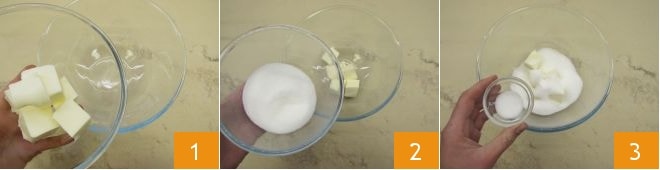 To prepare the S-shaped cookies, first place the cubed soft butter in a bowl 1. Then add the sugar 2 and salt 3.