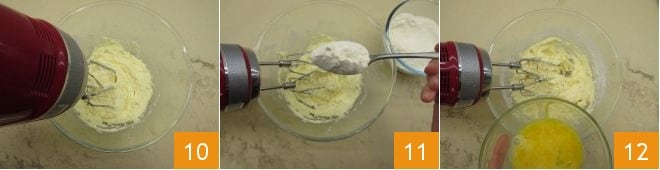 When the eggs are well absorbed and the mixture is well whipped 10, add half of the flour 11. Continue mixing with the beater until fully absorbed. Then add the remaining eggs 12 and mix again.