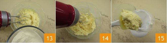 When they are completely absorbed, add the second part of the flour 13 and work everything until you get a consistent and well-whipped mass 14. Then transfer the dough into a pastry bag fitted with a 1/2-inch star nozzle 15.