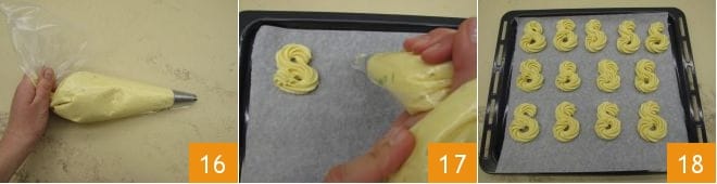 Close the back of the pastry bag to prevent the dough from coming out the other side 16 and shape the cookies on a baking sheet lined with parchment paper. You should gently squeeze in the center and make an S motion 17. Continue like this until the tray is complete 18. Then, let it rest in the refrigerator for 5 minutes, then bake in a fan oven at 350°F for 15 minutes.