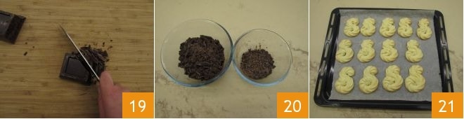Meanwhile, chop the dark chocolate 19; then transfer 9 oz into one bowl and 1.5 oz into another. When the cookies are slightly golden, remove them from the oven 21 and let them cool completely 21.