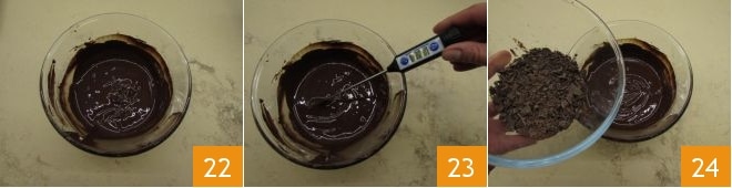 When the cookies are completely cool, melt the larger portion of chocolate 22 until it reaches 113°F 23. The chocolate can be melted in a bain-marie or in the microwave. Once you reach the temperature of 113°F, also add the remaining chocolate 24.