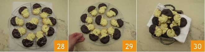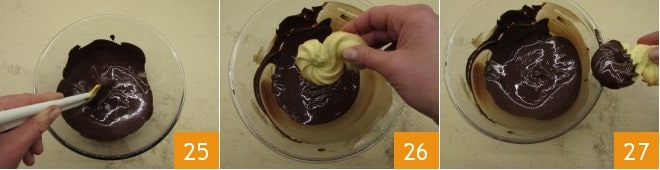Mix vigorously 25 and bring the chocolate to a temperature of 86°F. At this point, you can dip the cookies halfway into the chocolate, removing the excess chocolate by lightly scraping the base on the edge of the bowl (26-27).