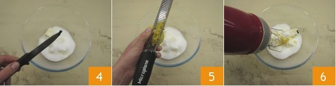 Then add the vanilla seeds 4 and lemon zest 5. Mix everything with an electric beater 6.