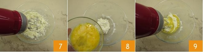 until you get a well-whipped mass 7. Then add half of the eggs 8 and work with the beater for a few more minutes 9.