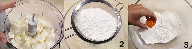 To make matchstick cookies, start by preparing the shortcrust pastry: remove the butter from the refrigerator and keep it at room temperature for about 20 minutes, then put the flour and the butter cut into pieces in a blender 1. Blend everything very well until you get a sandy and floury mixture; then transfer it to a large bowl and add the sifted powdered sugar 2, the seeds of the vanilla pod, two egg yolks, and a pinch of salt 3.