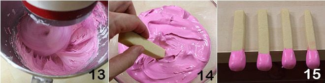 Now add the liquid red food coloring (or, if you prefer, in powder or gel) little by little, continuing to beat until you have obtained the desired color 13. When the shortcrust sticks are baked, after letting them cool completely, start with the decoration: dip the tip in the royal icing 14 and place the matchstick cookies on the edge of a table, with the glazed end facing outward, to dry 15. It will take about 1 hour for the royal icing to dry completely, then the matchstick cookies will be ready and can be served and enjoyed as a snack.