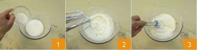 To prepare the Black Forest tiramisu, start with the cream. In a bowl, pour in the cold cream from the refrigerator, add the sugar 1, and start the beaters at medium speed and then a bit higher. This way, it will whip perfectly to stiff peaks 2. Then work the mascarpone with a spatula for a few moments, so it softens 3.