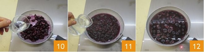 As soon as you notice the juice coming out of the cherries, add the liqueur: be very careful of the potential flare-up 10. When the alcohol has evaporated, add the water 11 and bring to a boil, then turn off the heat 12.