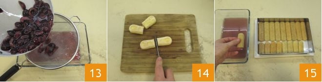 Pour the cherries into a strainer and collect the hot juice, letting it cool for a few moments 13. In the meantime, make sure the ladyfingers fit perfectly in the 10x6 inch adjustable frame placed on a plate (alternatively, a rectangular mold will work as well), so adjust a portion of the cookies so they fit without difficulty 14. Start soaking the ladyfingers one at a time, being careful not to soak them too much, and distribute them around the perimeter 15.