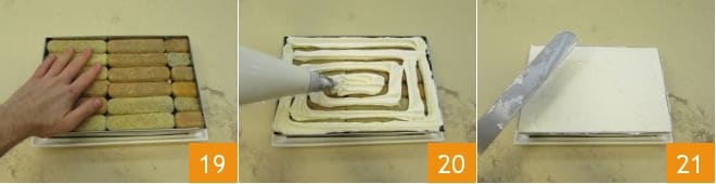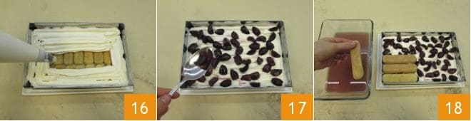 On the base, form a layer of cream 16 and sprinkle with the sautéed cherries 17. Finally, make another layer of ladyfingers, soaking them in the remaining warm liquid, but this time placing them in the opposite direction of the initial layer 18.
