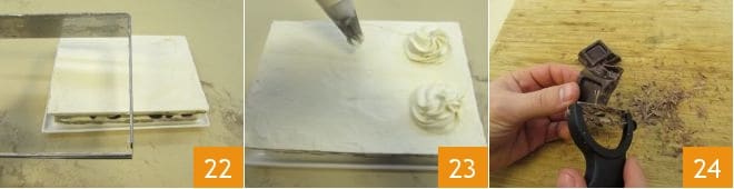 Remove the frame 22 and proceed with decoration. Retrieve the cream from the fridge and pipe 6 tufts, spacing them apart, imagining dividing the dessert into 6 servings 23. Grate the chocolate with a vegetable peeler 24