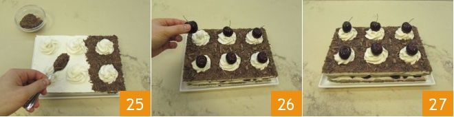 and sprinkle the tuftless part with the curls 25. Finally, decorate the tufts with fresh cherries 26. And here is your delicious and scenic Black Forest tiramisu ready 27!