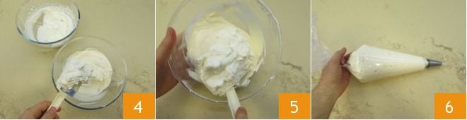 Add the whipped cream a little at a time 4. With the first spoonful, you can soften the mascarpone, and for the rest, you can fold it in more delicately 5. Once everything is combined, pour into a piping bag with a flower nozzle and let it rest in the refrigerator for at least 30 minutes 6.