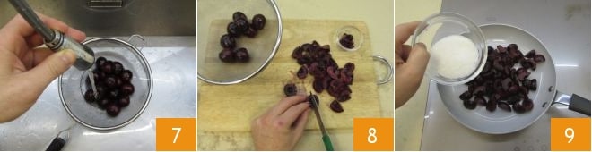 Meanwhile, take care of the cherries. Briefly rinse and dry them 7, then cut them into four parts, removing the stem and seed 8. Pour into a non-stick pan along with the sugar, turn on the burner to medium temperature and let it heat for a few minutes 9.