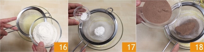 Add the dry ingredients to the yolk and milk mixture, sifting them: first the flour 16, then the baking powder and salt 17, and finally the Nesquik 18.