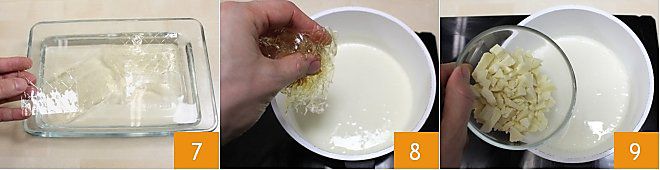 Meanwhile, soak the gelatin in cold water for about 10 minutes 7; after the necessary time, squeeze the gelatin well and add it to the mixture 8, stirring to dissolve it completely. At this point, add the coarsely chopped white chocolate 9 and