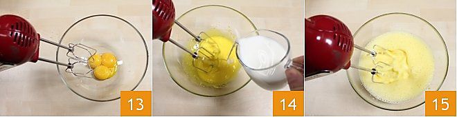 Now move on to the preparation of the blinis batter: separate the egg yolks from the whites and keep them aside, and work them in a bowl with an electric mixer or a hand whisk 13, pouring the cold milk in a thin stream 14. Continue beating until a homogeneous and frothy mixture is obtained 15.