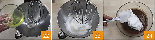 Whip the egg whites with a mixer or stand mixer and beat them until stiff peaks form (22-23). Add the whipped egg whites to the yolk and Nesquik mixture 24 and