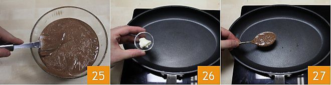 gently fold them in with a spatula, mixing from bottom to top to avoid deflating them 25. In the end, you will obtain a homogeneous and fairly fluid and frothy mixture. Melt the butter in a preheated non-stick pan (or crepe pan) 26, so the blinis do not stick, then take a spoonful of batter at a time (about 0.5-0.7 oz) and pour it onto the pan 27.