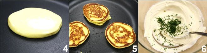 Heat and lightly butter a non-stick crepe pan, when it's hot, pour in a ladle of batter which will puff up to form a pancake about 3 inches in diameter 4. Once the bottom has set, flip the blini using a spatula and brown the other side as well 5. Continue this way until all the batter is used. Start preparing the garnish for the blinis: in a small bowl, mix the sour cream to make it creamy and add chopped dill (reserving a little for garnish), salt, and pepper 6.