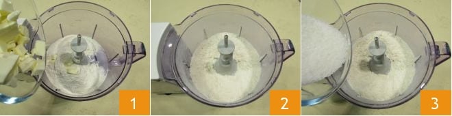 To prepare the blueberry and chocolate tart, start with the shortcrust pastry. In the mixer, pour the flour together with the butter and a pinch of salt 1 and blend until you get a sandy mixture 2. At this point, continue working everything in the mixer, therefore add the sugar 3