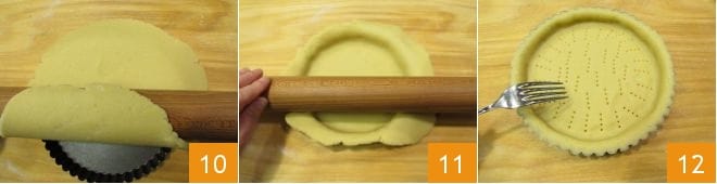 and then unroll it onto the baking pan 10. Remove the excess dough by running a rolling pin 11 or a knife over the top (the excess dough can be frozen wrapped in film or used to make delicious cookies) and then prick the base with a fork 12.
