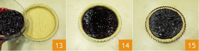 At this point, pour the blueberry compote 13 and level until it is completely distributed over the entire surface 14. Bake the tart in a preheated static oven at 355°F for 40 minutes on the lowest shelf; once done, remove and let it cool completely 15.