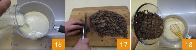 Once the base has cooled, work on the whipped ganache. Heat the cream in a saucepan until it nearly boils 16. Meanwhile, chop the dark chocolate 17 and add it to the sufficiently hot cream: but first, turn off the heat 18!