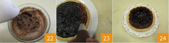 you should obtain a thick cream, it will take 3-4 minutes (the times are indicative because it highly depends on the temperature of the bowls and the environment) but be careful not to leave it for too long in the cold as it will become impossible to work with 22. Transfer to a piping bag with a star nozzle and start decorating the blueberry and chocolate tart 23. Finally, decorate with a few fresh blueberries and enjoy 24!