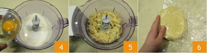 the egg 4, the lemon zest, and operate the blades again: this time, however, you should only mix, so lower the speed to mix. As soon as the mixture is compacted 5, transfer it to the work surface and knead for a few moments to obtain a homogeneous dough. Wrap in plastic wrap and let it rest in the refrigerator for at least an hour 6.