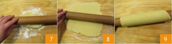 Once the shortcrust pastry is cold, take it back, place it on a floured work surface, and beat it vigorously to make it pliable again 7, sprinkle with a pinch of flour, and roll out the dough with a rolling pin 8 until you obtain a disk about 1/2 inch thick, large enough to cover an 8-inch mold (there's no need to butter and flour it first since this dough is very buttery). To help you roll it out, you can wrap the pastry around the rolling pin 9