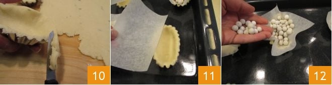 Then, with a knife, cut away the excess dough 10 to even the edge. Place a rectangle of parchment paper inside each boat 11 and distribute ceramic balls 12 for blind baking. Bake the boats for about 15 minutes in a preheated static oven at 392°F on the center rack.