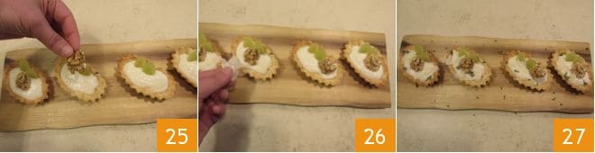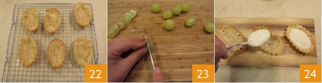 so they can cool completely 22; you can then start filling them: wash the grape berries and cut them into thirds lengthwise 23. Fill the boats with a tablespoon of Parmesan cream 24