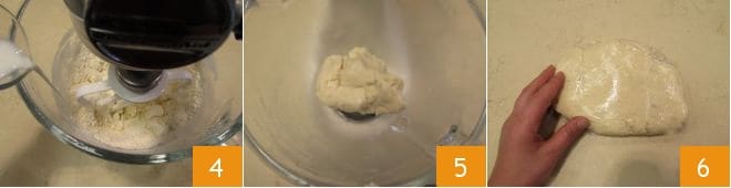 Turn on the stand mixer at medium speed, add the dose of cold milk in a thin stream 4, and let the mixer run until a rather compact mass is formed 5 (if you don't have a stand mixer, you can easily make this dough by hand, trying to knead quickly and briefly to avoid warming the pastry too much). Transfer the dough onto the work surface (preferably cold) and work it just enough to form it into a loaf. Flatten it slightly with your hands. Wrap it in plastic wrap 6 and let it rest in the fridge for 30 minutes.