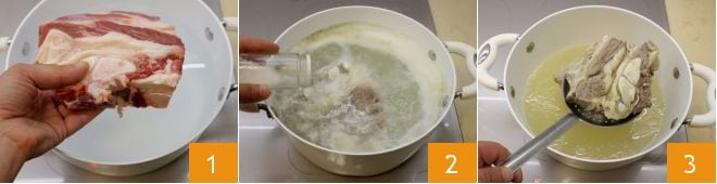To make the boiled meat croquettes (bitterballen), start by preparing the boiled meat: place the beef in 1.5 liters of water 1, add salt 2, and let it cook over medium heat until the meat has softened; this will take at least 1 hour. Occasionally, skim the impurities that form on the surface with a skimmer. When the meat is cooked, drain and let it cool 3, while keeping the broth aside.