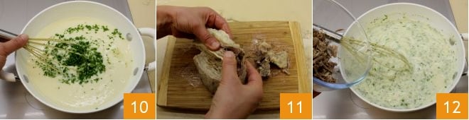and the chopped parsley 10. Cook for a few more minutes to thicken it; then shred the meat with your hands into small pieces 11 and add it to the béchamel 12.