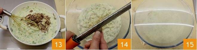 Mix 13 and turn off the heat. Transfer the mixture to a large bowl, grate the nutmeg 14, and cover it with plastic wrap 15: it should rest in the refrigerator for 3-4 hours, or better yet, overnight.