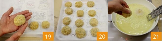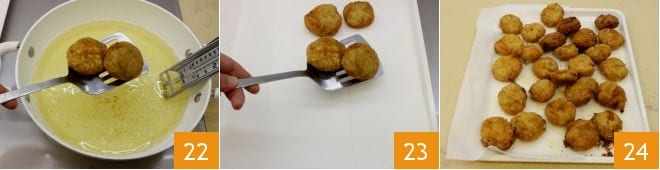 and breadcrumbs 19. As you make them, place them on a tray lined with parchment paper 20 and put them in the refrigerator covered with plastic wrap to firm up for at least 30 minutes; then fry a few at a time in hot oil (you can use peanut oil), heated to a temperature of 375°F and maintain it, checking with a food thermometer 21.