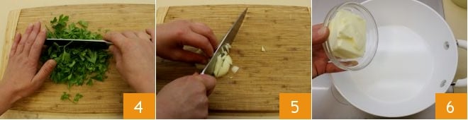 While the meat is cooking, prepare the sauce: chop the bunch of parsley 4, peel and finely chop the onion 5, and place the butter in a large pan 6.